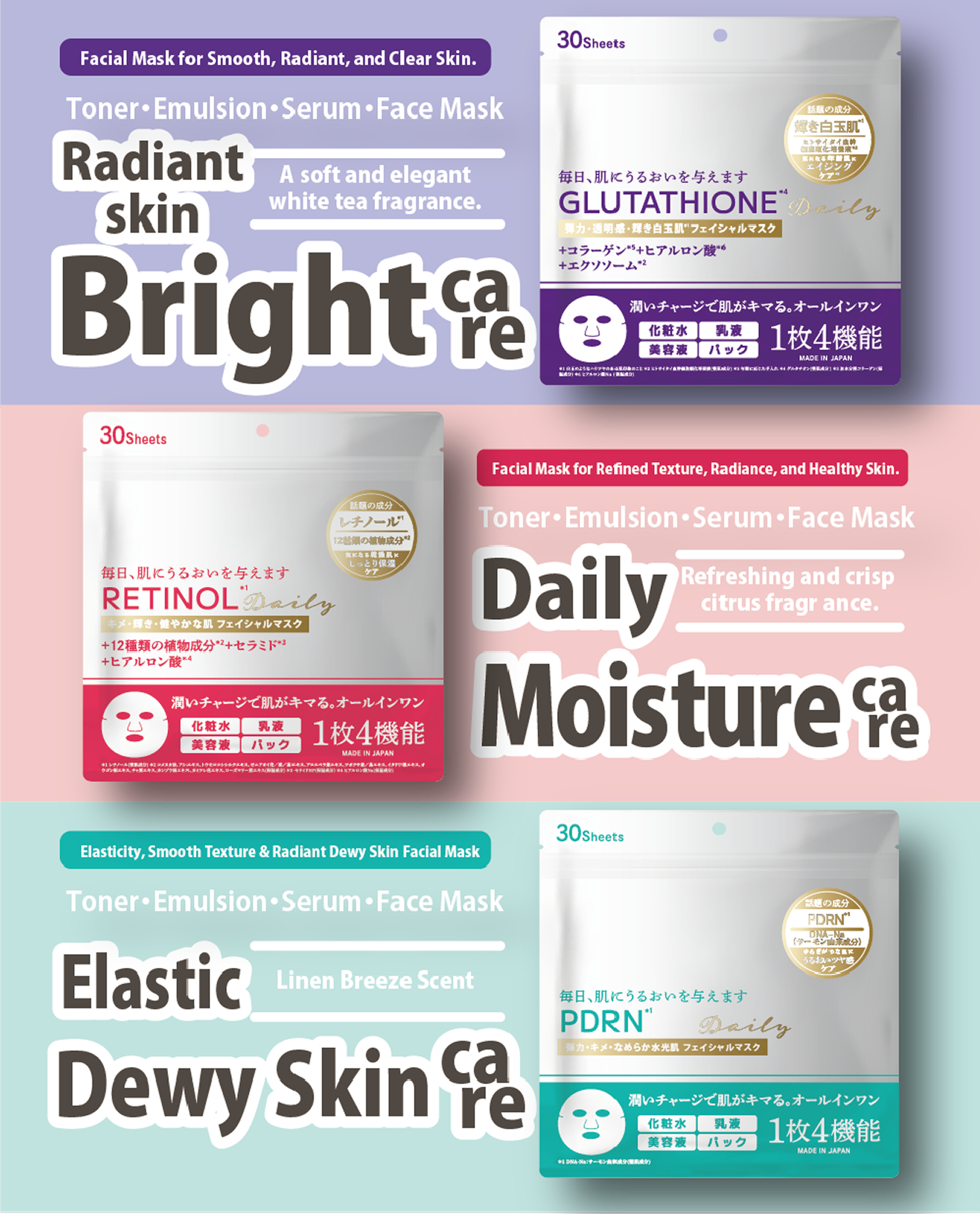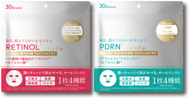 Each mask is formulated with one of three trending key ingredients. Designed with additional beauty ingredients tailored to different For a clear and luminous look → Glutathione*5 skin goals. Radiant Mochi-Like Skin*1 → with Glutathione*2, Collagen*3, and Hyaluronic Acid*4 Daily Hydrated Skin → with Retinol*5, 12 Botanical Extracts*6, and Ceramides*7 Glowing Dewy Skin*8 → with PDRN*9, Allantoin*10, and Collagen*3